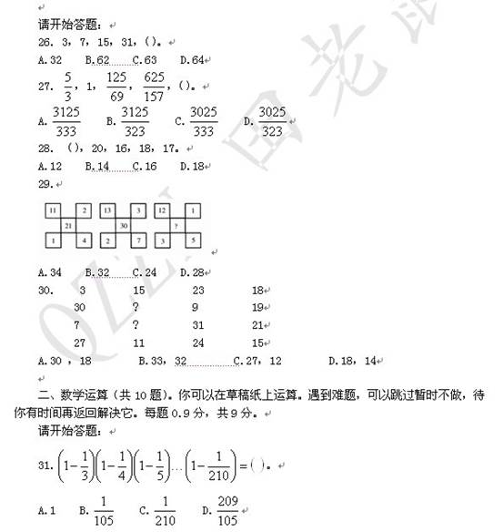 一、数学推理(共5题)。给你一个图表或数列,但其中缺少一项或麯在,要求你仔细观察图表中的数字规律或数列的排列规律,然后人四个供选择的选项中选择你以为最合理的一项来填“?”或空缺,使之符合图表中的数字的规律或原数旬的排列规律。每题0.7分,共3.5分。