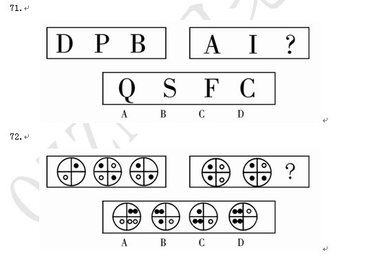 71.C【解析】第一组图中的图形都是两笔,而第二组中的图形都是三笔,问号处的图形当也是三笔,所以答案为C项。