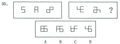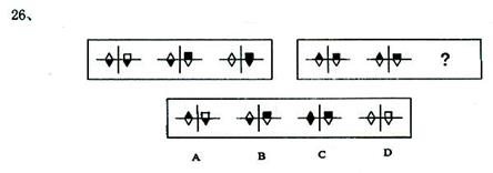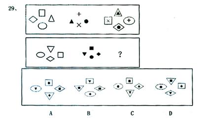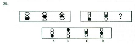 解答:正确答案为D。因为只有D能使两套图形具有相似性,仅仅元素不同,一个是半圆,一个是半个正方形,但两组图形中元素的排列规律完全相同。