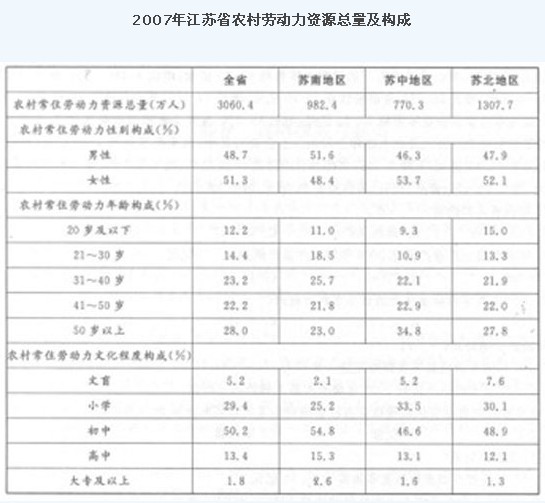 D项错误,苏南地区的农村劳动力人口具有高中文化程度的人口数量比苏北地区少