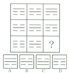 49.B【解析】第一行中,可以看出规律为:实线+虚线=实线,虚线+实线=实线,虚线+虚线=虚线,第二行验证了这一规律,且实线+实线=虚线,所以可知问号处的上中下线三条依次为:虚线、实线、虚线,所以B项为正确答案。