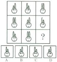 51.B【解析】图形规律为:每一行的兔子嘴都有一个向上弯,一个向下弯,一个平,所以排除C项;兔子眼睛都有一个双白,一个左黑右白,一个左白右黑,所以排除D项。兔子耳朵都有一个双长,一个左短右长,一个左长右短,所以排除A项,所以答案为B项。