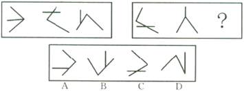 53.A【解析】第一组图的规律为:三个图形只有一个图形出现两边露头的交叉,排除C项,只有一个图形三条线段交于一点,除去两边露头的交叉图形外,另两个图形除去构成较大角的那两条线外,另一条线在角内及角外各有一个图形,无论那条线在何处与成较大角的两条线相交,都不会在其中一条线段未成角的那个端点相交,排除D项。三个图形的角的方向,一是向左,一是向右,一是向下,第二组图形中的方向已有了向右及向下,故而问号处当向左,所以A项为正确答案。