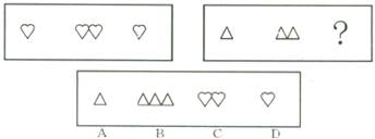 54.A【解析】本题考查的是元素的数量,第一组图形中鸡心图案的数量为1、2、1,所以第二组图形三角的数量也应符合这一规律,所以A项为正确答案。