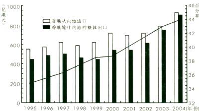 117.C【解析】2004年出口额约为840亿港币,1995年出口额约为450亿港币,故年均增长率为(870-450)÷450÷9×100%≈10.4%,所以C项为正确答案。