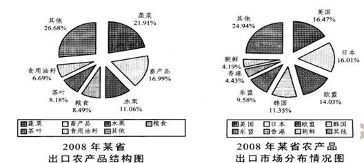 2008年,某省农产品进出口贸易总额为7.15亿美元,比上年增长25.2%。其中。出口额为5.02亿美元,增长22.1%;进口额为2.13亿美元。增长33.2%。农产品进出口贸易额占全省对外贸易总额的4.5%。出口额居前5位的产品为蔬菜、畜产品、水果、粮食和茶叶。而绿茶出口额占茶叶出口额的四分之三。全省农产品对东欧、非洲、拉美等国家和地区的市场进一步开拓,出口额比上一年进一步增长。其中,对美国的出口额增长16.0%;对日本的出口额增长7.3%;对韩国的出口额增长59.8%;对东盟的出口额增58.6%。