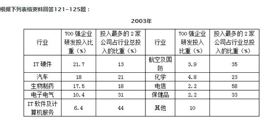 121、【答案】C。解析:2003年全球研发投入700强企业在各行业中的比重,IT硬件21.7%最高,之后依次为汽车18%、生物制药17.5%和电子电气10.4%,应选C。.. .