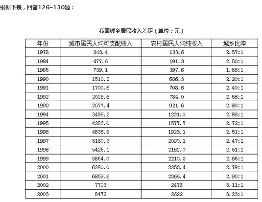 127、【答案】D。解析:1999年城乡收入差额为5854.0-2210.3=3643.7元,2000年为6280.0-2253.4=4026.6元,2002年为7703-2476=5227元,2003年为8472-2622=5850元。应选D。