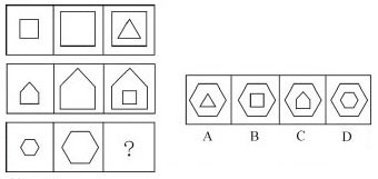 63.C【解析】第一行图形中,第三个图形=第二个图形包含了少掉一边的第一个图形(正方形少一边为三角形)。第二行图形中,第三个图形=第二个图形包含了少掉一边的第一个图形(五边形少一边为四边形)。第三行也应符合这一规律,第二个图形包含少掉一边的第一个图形(六边形少一边为五边形),所以正确答案为C项。