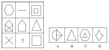 61.B【解析】观察第一组图形,可知其规律为不封闭、封闭、不封闭、封闭、不封闭,据此规律可知问号处当为不封闭区间,排除A、C项。观察不封闭区间的开口方向,依次为向左、向上、向下,没有重复。第二组为向右、向下,则问号处当为向左或向上,才没有重复,所以正确答案为B项。