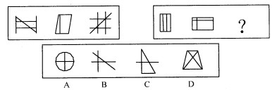 54. A 此题考察图形叠加。由第一组图可知,前两个图形叠加后去掉正方形的两条竖线,即得到第三个图形“王”;依此规律,第二组图中前面两个图形叠加后,去掉矩形的两条竖线所得图形A即为答案。因此,答案为A。