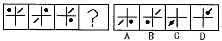 56. C 此题考察位置移动。黑点的移动呈顺时针依次移动一个区间,问号处图形的黑点应位于左下;斜线段的位置分别为右上、左下、右上,问号处图形的斜线段应位于左下。因此,答案为C。