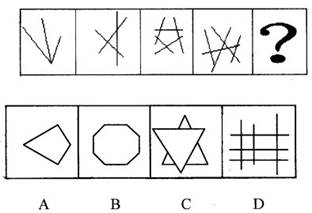 58. D 此题考交点数量。图组中各图形的线段交点个数分别为1、3、5、7、(9)。因此,答案为D。