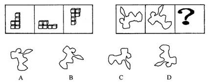 55. C 此题为空间重构类题目。此题不仅要考虑正方体每一面的位置,还要考虑字母的方向,可采用排除法:F一定位于E的右面,因此排除答案A项;字母F与A不可能是相反方向,排除答案B项;字母B和C应该为同方向,排除答案D项;字母B和C同方向,且字母B与字母D的直线笔画呈垂直状,因此,答案选C。