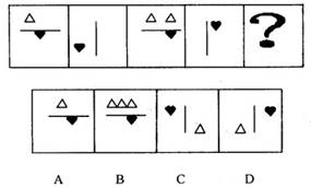 60. B 此题考察图形的样式。隔项看规律,奇项的图形都是水平横线,且横线上方的白色三角形依次增加1个,因此,问号处的图形应为水平横线,上方三个白色三角形,下方一个黑色桃心。因此,答案为B。