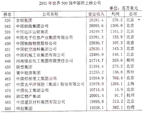 A.表中利润额排名前三的企业在世界500 强中的排名均在400以内
