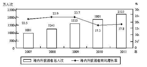 2011年,某市接待海内外旅游者2123万人次,同比增长17.8%。其中,接待入境旅游者87.71万人次,同比增长8.2%,在入境旅游者中,外国旅游者51.1万人次,同比下降8.6%;港澳台旅游者36.61万人次,同比增长43%。全年旅游总收入168.15%,同比增长27.20亿元。其中国际旅游创汇2.44亿美元,同比增长10.9%。