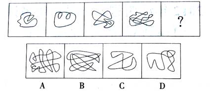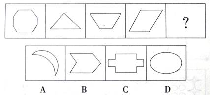 1.D【解析】给出的四个图形均为简单的封闭直线图形,其线条数分别为8、3、4、4,不构成规律,从对称性上也找不出合适的规律。此时观察四个选项,发现A、B、C均为凹图形,只有D项为凸图形,而题干四个图形也都是凸图形,由此确定答案为D。