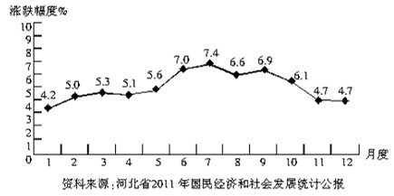 解析:由图所示得知2011年河北省居民消费价格月度同比,从而求出2011年河北省全年居民消费价格比上年上涨了(4.2+5.0%......+4.7%)/12=5.7%。