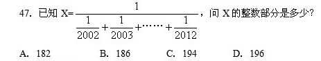 47.A【解析】由题意可知11/2012﹤1/x﹤11/2002,2012/11的整数部分是182,2001/11的整数部分是182,因此x的整数部分也是182。
