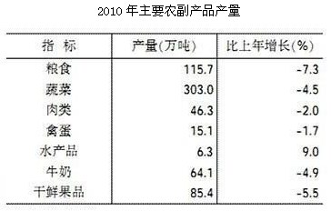 A.2010年该市粮食产量不到蔬菜产量的1/3