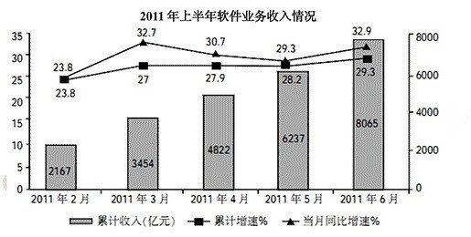 2011年上年年,我国软件产业实现软件业务收入8065亿元,同比增长29.3%,增速比去年同期高0.2个百分点;实现利润103亿元,同比增长3.49%。其中,6月份完成软件业务收入1828亿元,同比增长32.9,增速比5月份回升3.6个百分点。