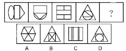 70.【解析】B。题干图形的封闭空间的数量分别为3、4、5、6个,因此问号处应填入一个含有7个封闭空间的图形,只有B项符合。