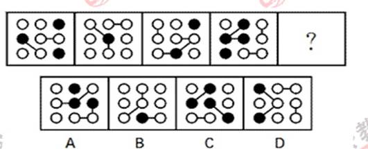 52.【答案】C。解析:考虑图形中孤立(未与其他圆圈用线相连)圆圈的个数,依次是5、4、3、2,应选择只有一个孤立圆圈的图形,只有C。