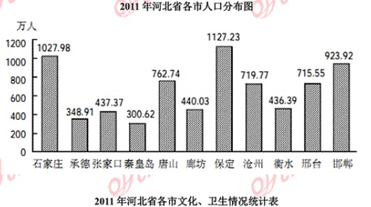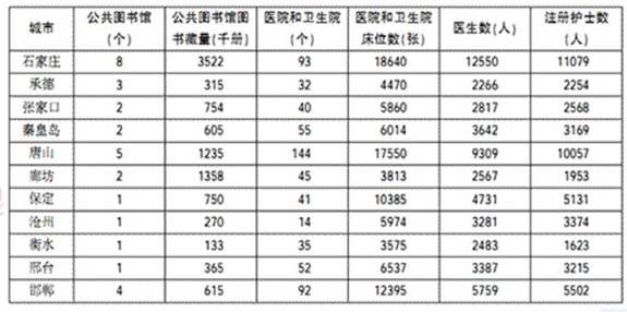 87.【答案】C。解析:由表格第二、四、最后一列可知,2011年河北省公共图书馆数量排在前五位的是石家庄、唐山、邯郸、承德、张家口、秦皇岛、廊坊市(后三市并列第五),注册护士数量排在前五位的是石家庄、唐山、邯郸、保定、沧州市,医院和卫生院数量排在前五位的是唐山、石家庄、邯郸、秦皇岛、邢台市,满足题意的就是石家庄、唐山、邯郸市3市,应选择C。