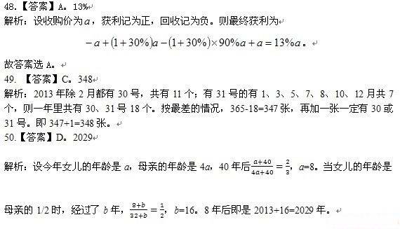 47.【答案】D。解析:少做错2道刚好及格,多做对一道多得4分,所以小伟实际得了60-2×4=52分。设作对x道,则2x-2(50-x)=52,解得x=38。
