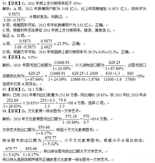 94.【答案】D。解析:2012年我国网民使用台式机上网占比为70.6%,使用笔记本上网的占比为45.9%,则所求为70.6-45.9=24.7个百分点,答案选D。