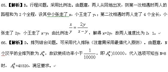 63.【解析】B。工程问题。采用赋值法,赋值每个农民割麦子的效率为1,由题意,甲组割麦子的总量为20×1.5+10×1.5=45,故每个农民捆麦子的效率为45÷1.5÷10=3;设从10点之后经过x小时,乙组的麦子全部捆好。故乙组割麦子的总量为15×(3+x),捆麦子总量为20×3×x,二者应该相等,解得x=1(小时);故11:00时麦子可以全部捆好(最后一步可以采用代入排除)。