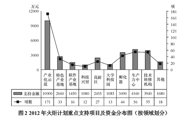 A选项,根据文字材料“2012年火炬计划重点支持项目445项”和图2可知,重点支持项目中产业化示范项目的比重为