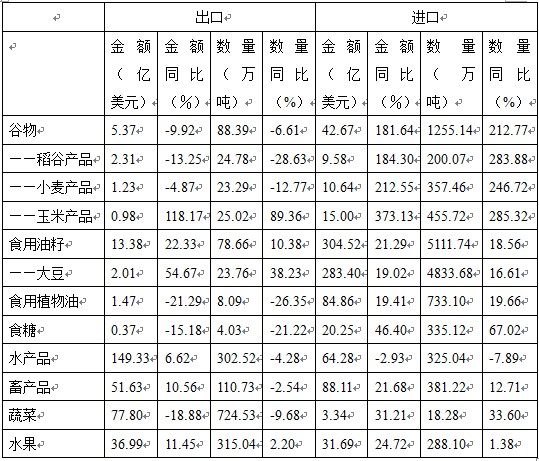 A选项,由表格可知,谷物、食用植物油、食糖、水产品、畜产品、蔬菜的出口量的同比增长率为负数,即有6类主要农产品的出口量同比下降,A选项错误;