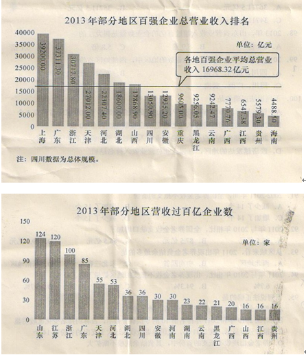 解析 由96题可知,A选项错误;2013年四川省营业收入超过百亿的企业数为36家,江西省营业收入超过百亿的企业数为16家,B正确;由图表可知,2013年部分地区百千企业总营业收入超过总平均收入的地区有7个,分别是上海、广东、浙江、天津、河北、湖北、山西,C错误;图表1可知,百强企业总营业收入靠前的为经济发达地区,D项属于常识性错误,故正确答案为B。