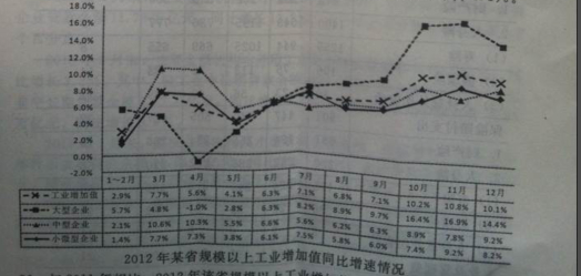 【解析】A选项考核读数比较,小微型企业10~12月的增速小于大型、中型,最小,错误;B选项增长量的比较,二者的增长率接近,小微型企业现期远大于中型,故小微型要高于中型,错误;C选项考核直接读数,错误。D选项考核简单计算,考查7、8、9月,正确。
