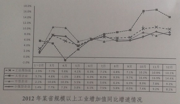 解析:观察图形,2012年3-10月份中型企业增速和规模以上工业增加值增速的曲线,差异最大的明显是4月份,差异为5.6%-(-1.0%)=6.6%,最大。