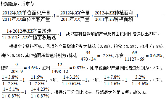 119、以下农作物中,2012年单位面积的产量同比增速最快的是: