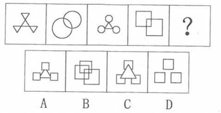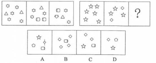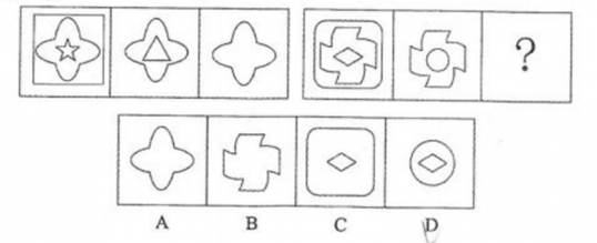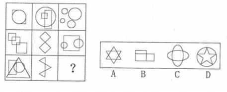 本题考查样式类。两段式的第一段中,第一个图形与第二个图形求同得到第三个图形。因此,第二段中,第一个图形与第二个图形求同,得到B选项。