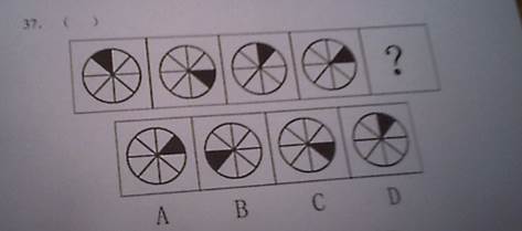 本题考查数量类规律,是对素种类数与个数的综合考察。第一段中,素的种类数为2、3、4,个数为7、6、5,呈现等差规律;因此,第二段中,前两个图素的种类数为1、2、?,个数为6、5、?,问号处应为3和4,综合两种规律,选择C选项。