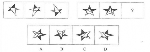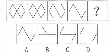 本题考查位置类规律。第一段中,第一个图沿着竖轴翻转得到第二个图,再沿着横轴翻转得到第三个图,依此规律,第二段中,第二图形沿着横轴翻转后,得到B选项,所以选择B。