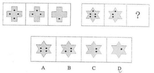 本题考查样式类。两段式的第一段中,第一个图形与第二个图形外部轮廓求同,内部的黑点相减得到第三个图形。因此,第二段中,第一个图形与第二个图形外部轮廓求同,内部黑点相减,得到C选项。