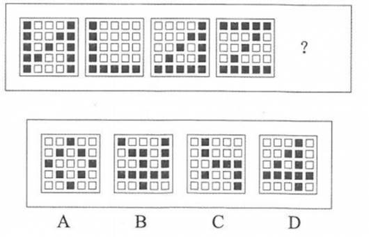 本题考查静态位置。题干中黑色方块都只出现在对角线和四周的位置,依此规律,只有A选项中所有的黑色方块出现在相同位置,所以选择A选项。