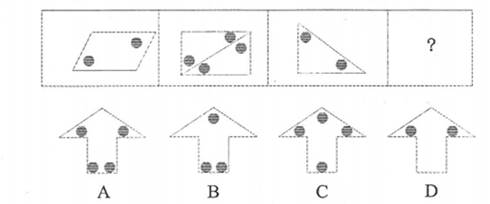 本题考查功能类。题目三个图形中都含有功能元素黑点,并且黑点都在锐角等位置,D选项中黑点位于锐角的位置,所以选择D。