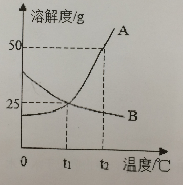 本题考查溶解度与温度的关系。由图可知,随着温度的升高,A物质溶解度上升、B物质的溶解度下降。A选项,没有给出温度,A物质和B物质的溶解度大小无法判定,A选项错误;B选项,随着温度升高,A物质的溶解度变大、B物质的溶解度变小,B选项错误;C选项,将t1温度降温,A物质的溶解度下降,A物质会析出,是过饱和溶液,C选项错误;D选项,从t2到t1时,B物质的溶解度上升,从饱和溶液变为不饱和溶液,没有B析出,故正确答案为D。