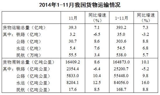 122.【解析】A。由于各领域1~11月和11月的同比增速均较小,对计算结果的影响不大,因此本题可转化为判断2014年1~10月货物运输总量最大的领域。铁路:(35-3.2)亿吨;公路:(303.6-30.7)亿吨;水运:(54.5-5.4)亿吨;民航:(538-55.5)万吨。目测可知公路最大(注意民航的单位是万吨),A项当选。