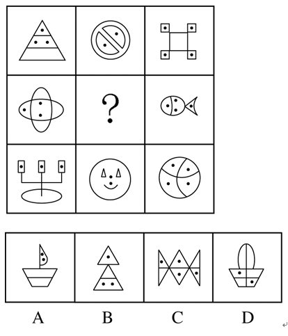 75.B【解析】本题为一组式题目,观察可知,在题干图形的每条边上,锐角和半圆均为一凸一凹,故正确答案为B。