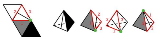 5.答案:B 解析 本题为四面体的空间重构题目。四个选项均有含一条直线的面,且该面有唯一点(如下图中绿色点 所示),故以这点为起点开始顺时针画边。如下图所示。