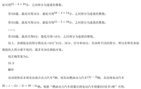 31.答案:D 解析 第一步:找出论点和论据。 论点:节目达到了当前同类节目的最高水准。 论据:该节目收视率比同类节目高 2%。 第二步:逐一分析选项。 A 项:嘉宾的评价与节目的水准无必然联系,无法削弱,排除; B 项:只是表明观众喜欢看电视综艺节目,但并未说明观众是否对于该节目的喜欢程度超过同类型的 其他节目,而且观众是否喜欢这个节目和节目的水准无必然的联系,无法削弱,排除; C 项:微博评论与节目的水准无必然联系,无法削弱,排除; 53 D 项:表明节目的水准和收视率无必然关联,那就说明由论据推不出论点,削弱论证,当选。 故正确答案为 D。