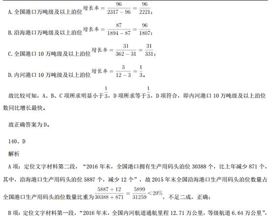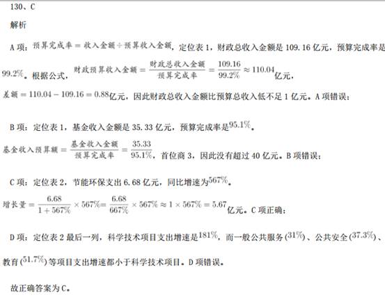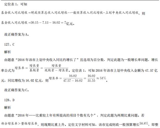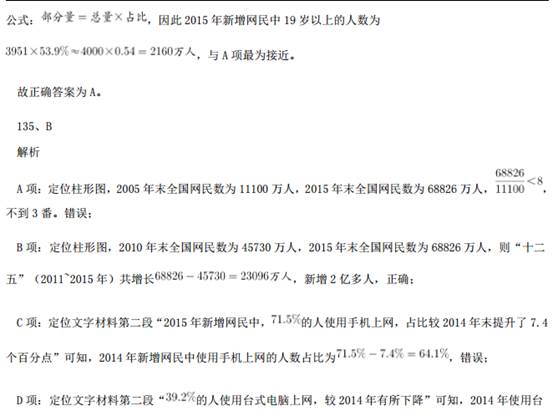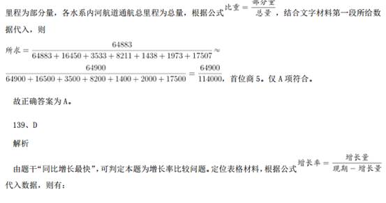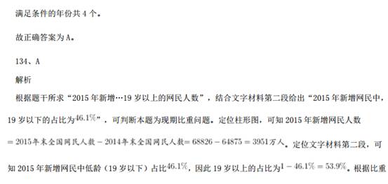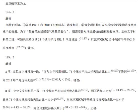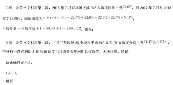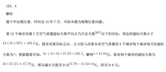 121、B解析 问题求“京津冀区域平均重度污染天数比……多多少天”,根据常识可知 7 月总天数为 31 天,定位材料 第 1 段:“与全国 74 个城市相比,京津冀区域平均重度污染天数占比高 4.4 个百分点”,即已知总体量和 部分比重的差值,求部分量的差值。可得,2015 年 7 月,京津冀区域平均重度污染天数比全国 74 个城市约